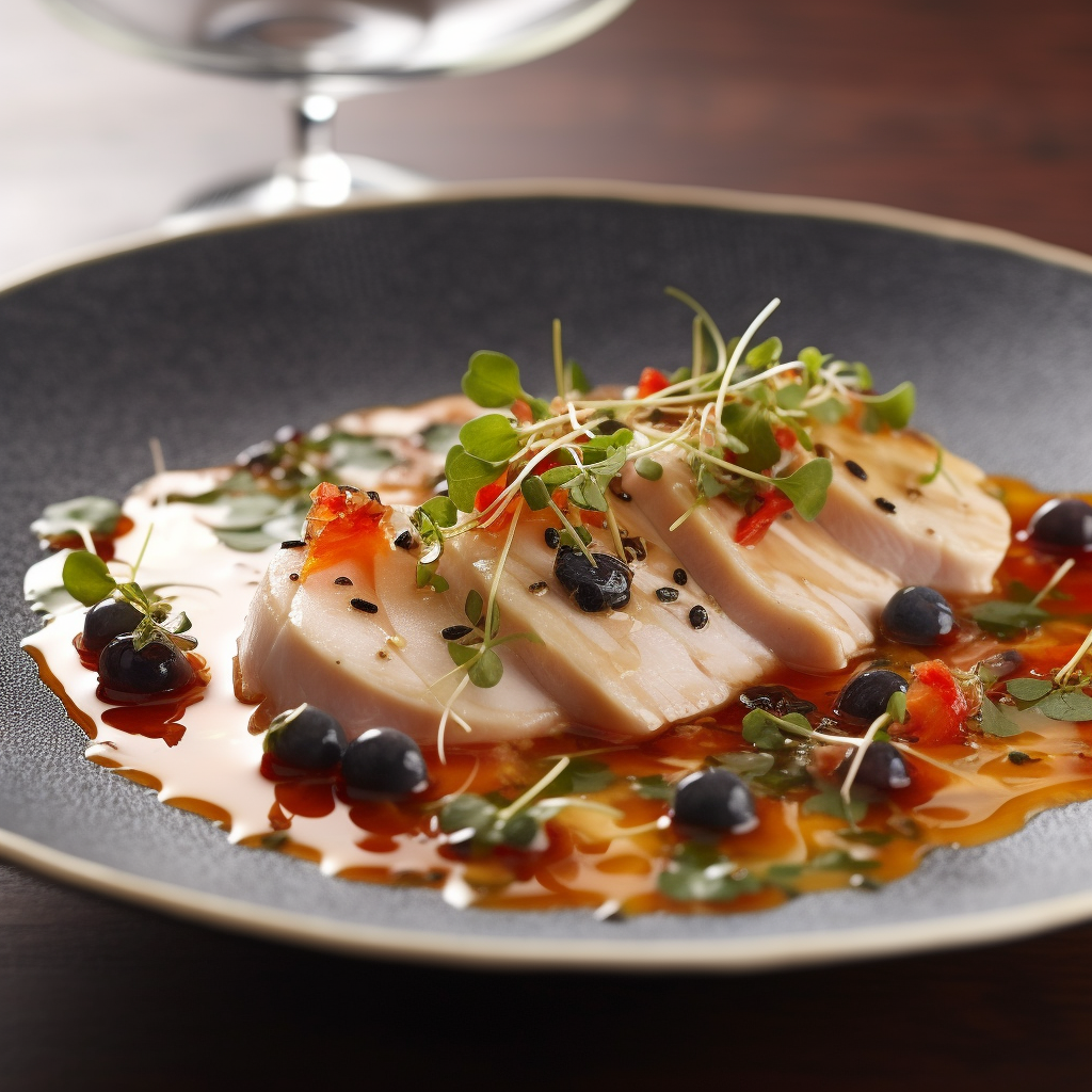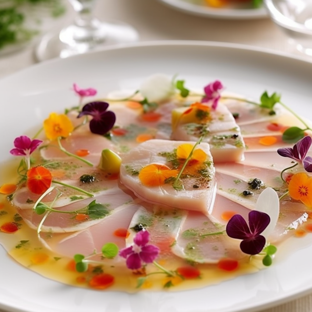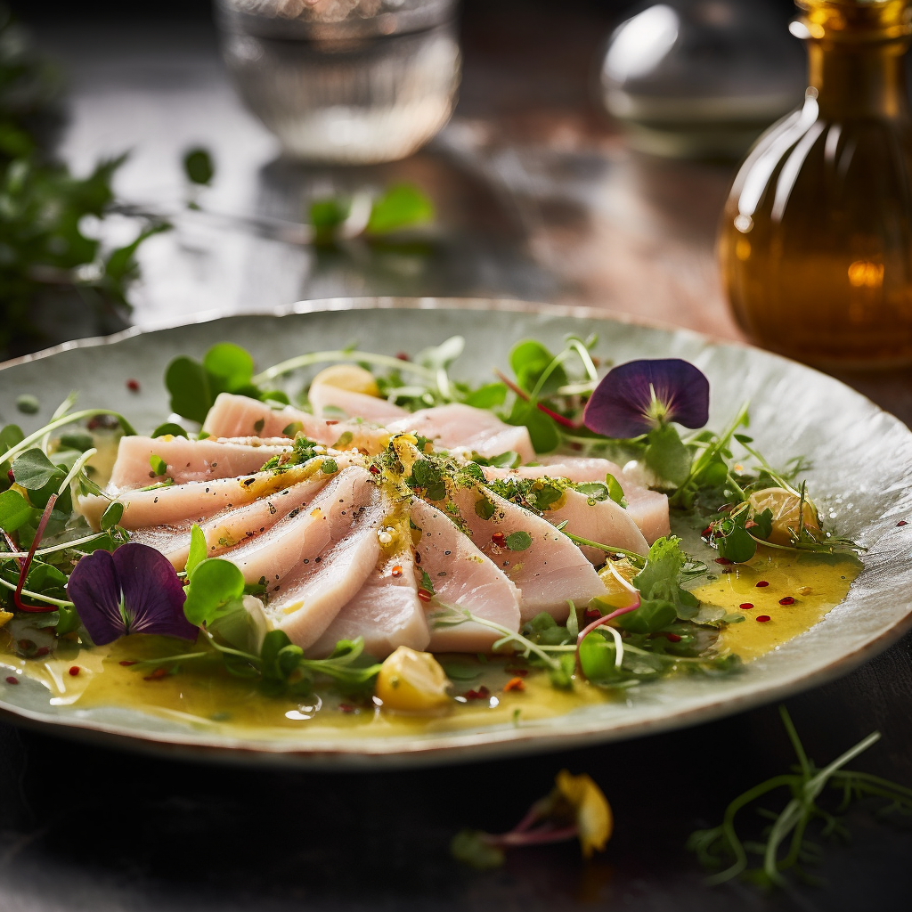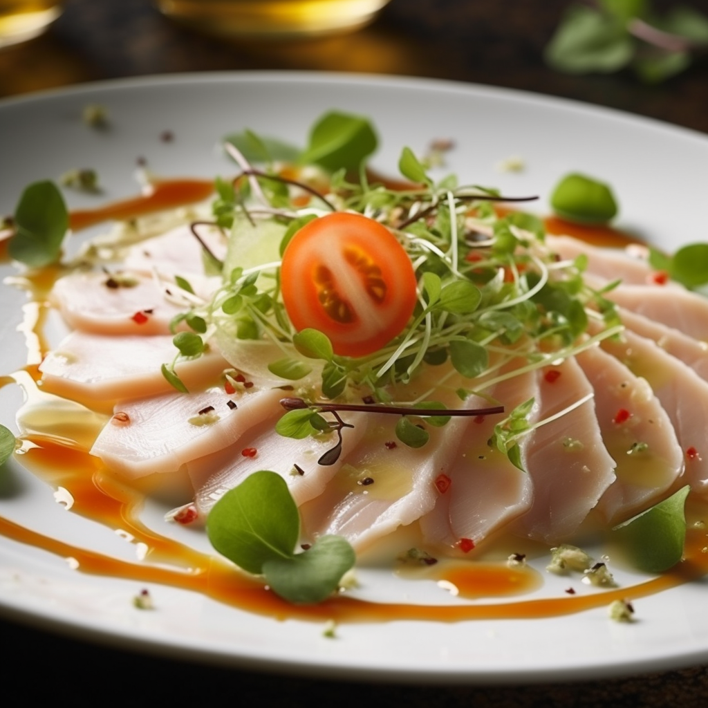 Imagine thin, translucent slices of velvety swordfish, artistically arranged on a pristine plate. The vibrant colors of the fish glisten under the soft lighting, promising a culinary journey that is as visually stunning as it is tantalizing to the palette.